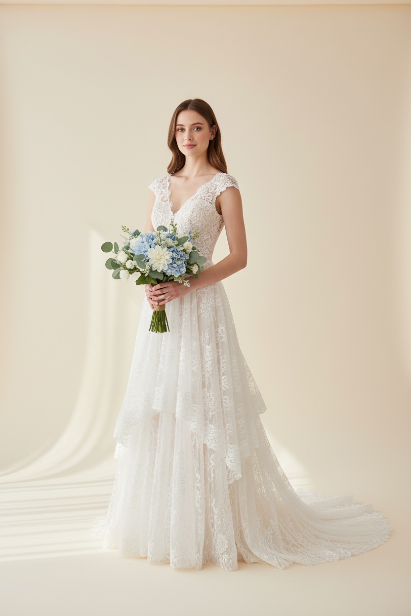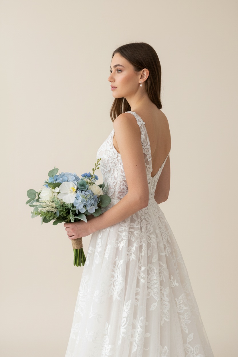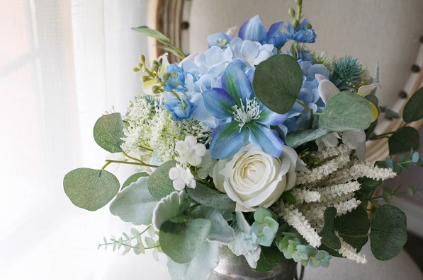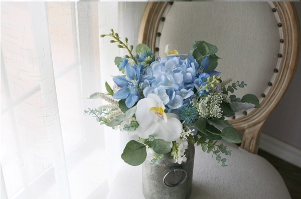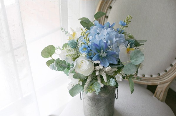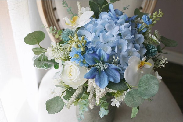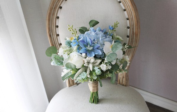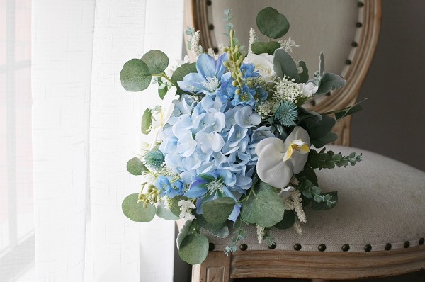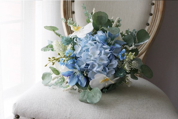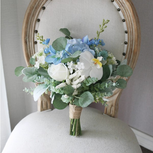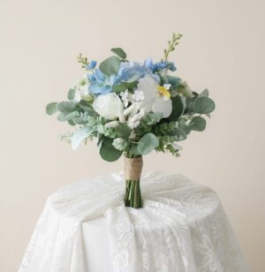 A scaled-down version of the bride’s bouquet, featuring the same refined blend of white orchids, roses, blue florals, and eucalyptus greenery. At half the size, it’s lightweight and easy to carry, offering a perfectly coordinated look for your bridal party while maintaining natural flow and style consistency.