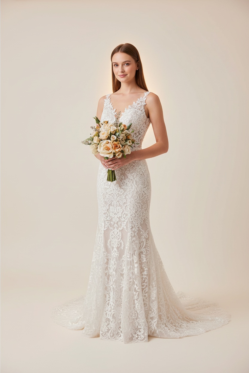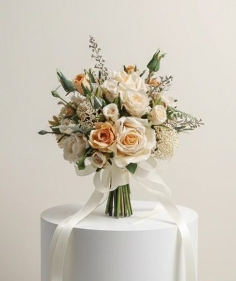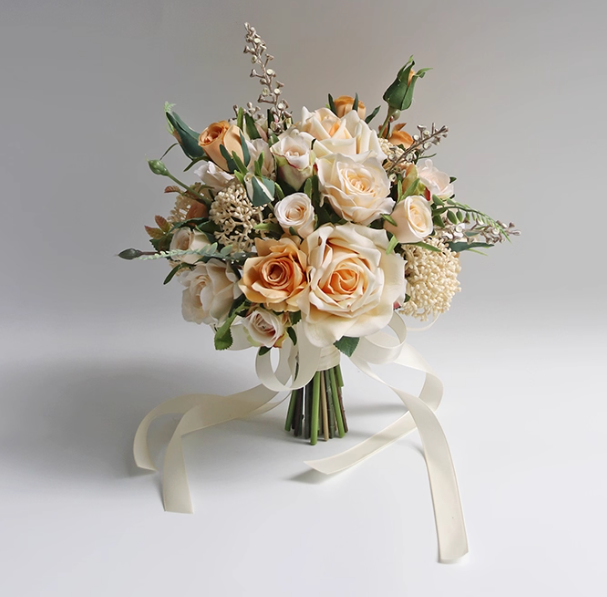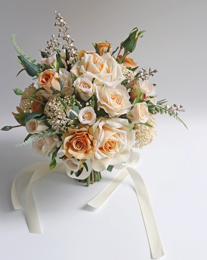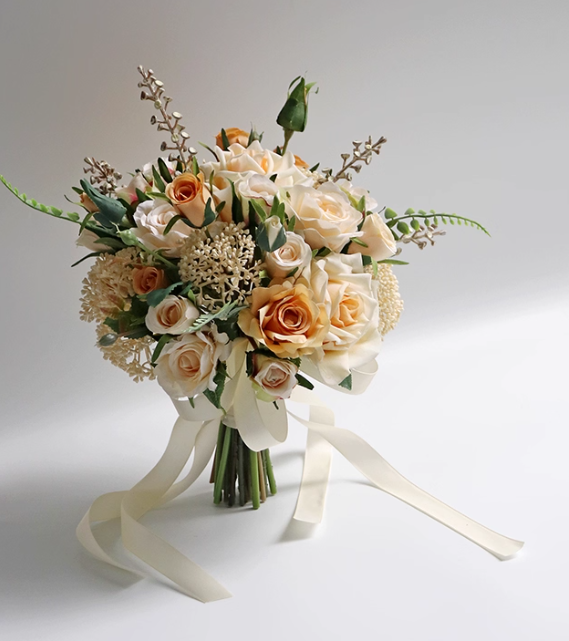 A timeless and romantic bridal bouquet featuring champagne, ivory, and soft peach silk roses, delicately accented with small white filler flowers, rosebuds, and lush greenery. Hand-tied with a flowing ivory ribbon, this bouquet combines elegance and durability, perfect for brides who want a realistic look that lasts a lifetime. Crafted from premium artificial flowers for a flawless, photo-ready finish on your wedding day.