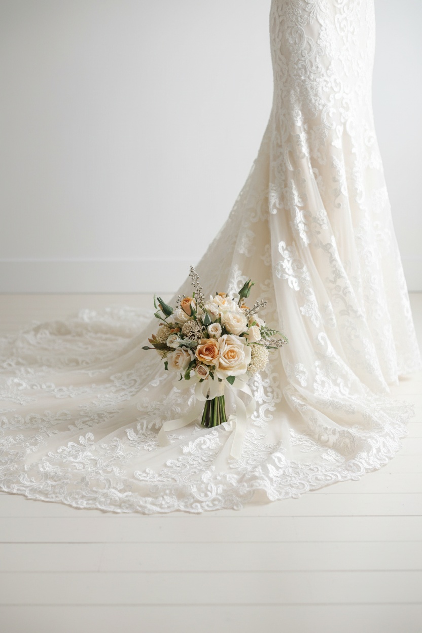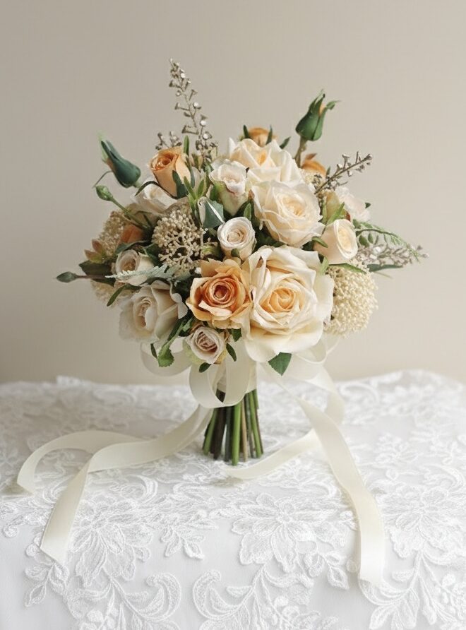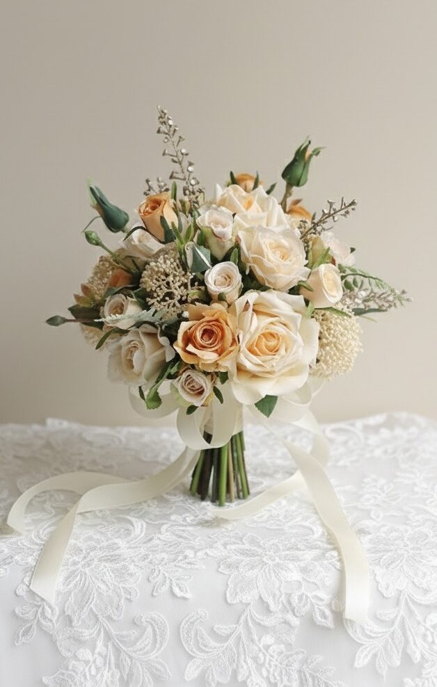 Elegant bridal bouquet featuring champagne, ivory, and soft peach silk roses with delicate filler flowers and greenery, finished with flowing ivory ribbon for a timeless wedding look.