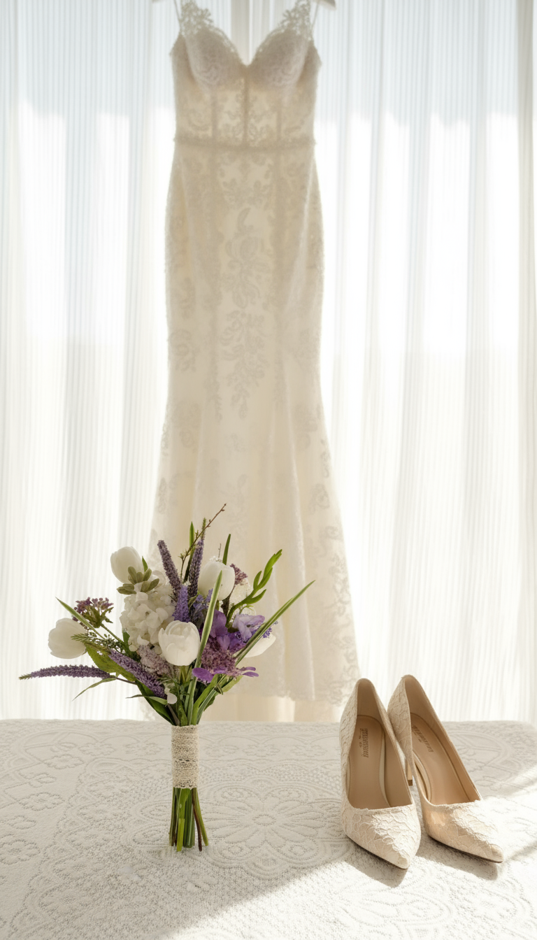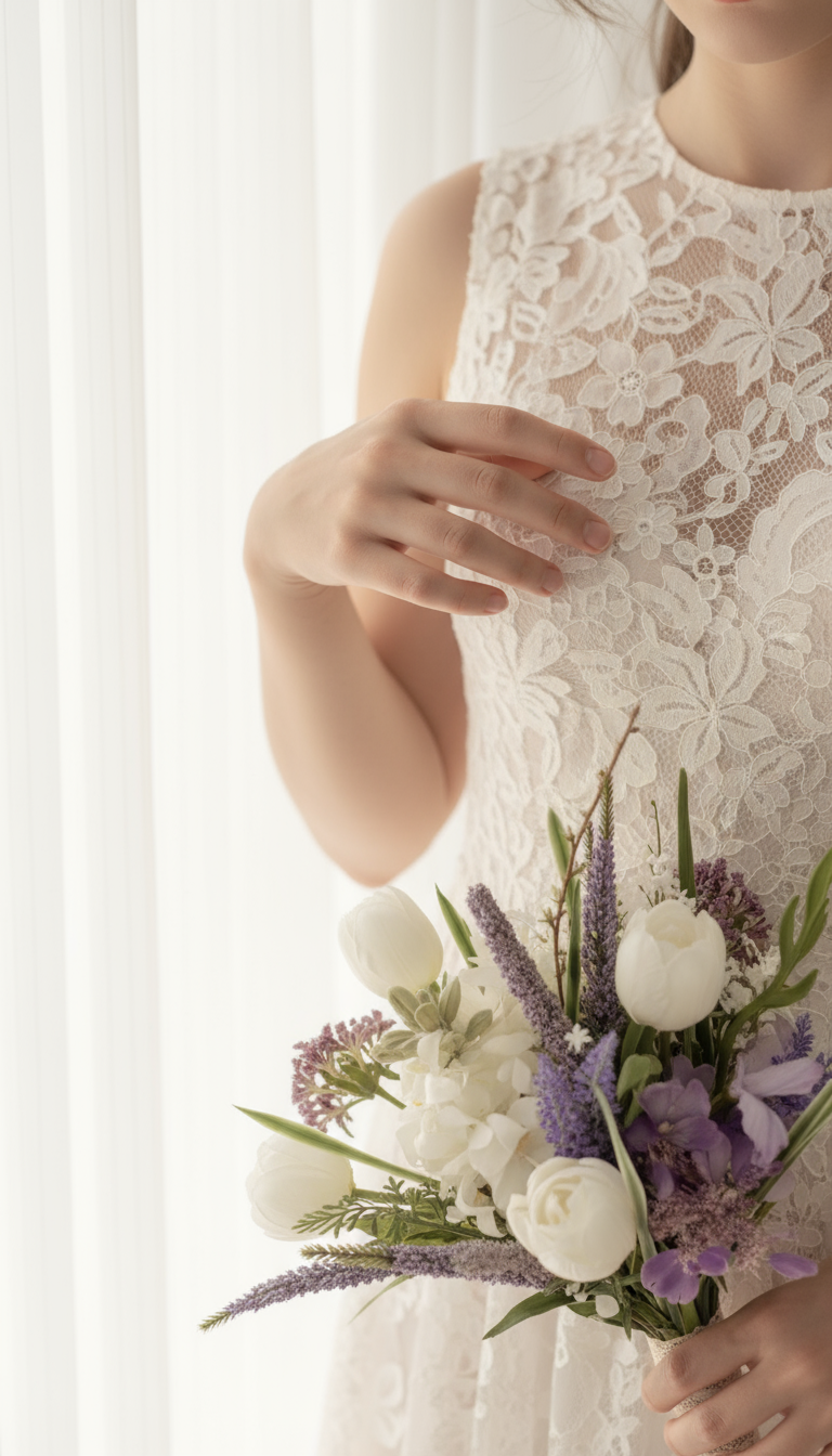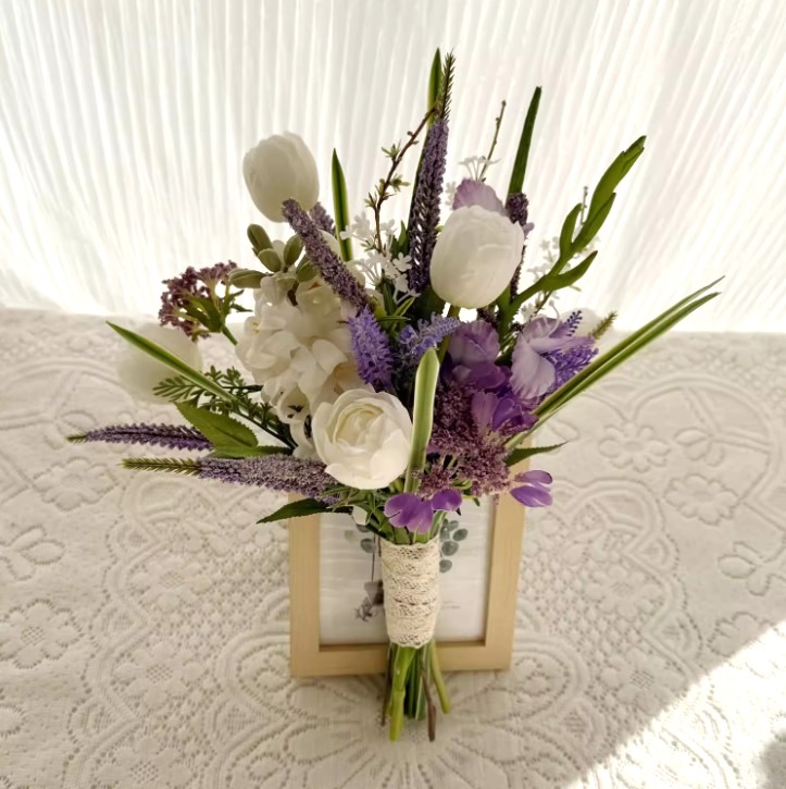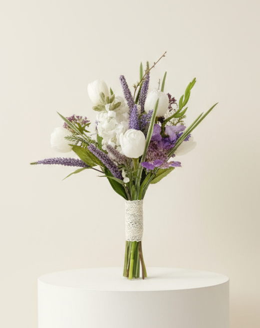 The Lavender Bloom Bouquet captures a soft, romantic charm with its blend of white tulips, ivory roses, and delicate lavender accents. This bouquet brings together elegance and freshness — perfect for brides who love a touch of colour while keeping a natural, graceful look.