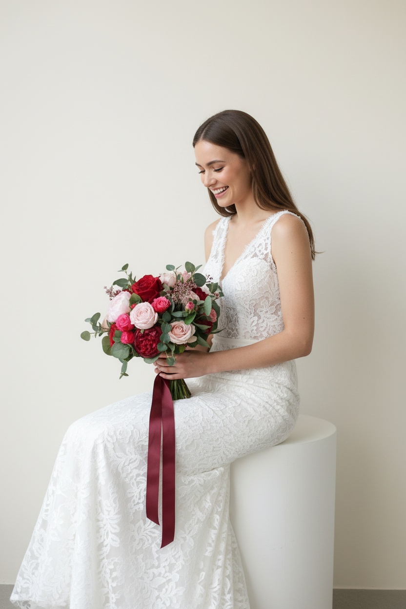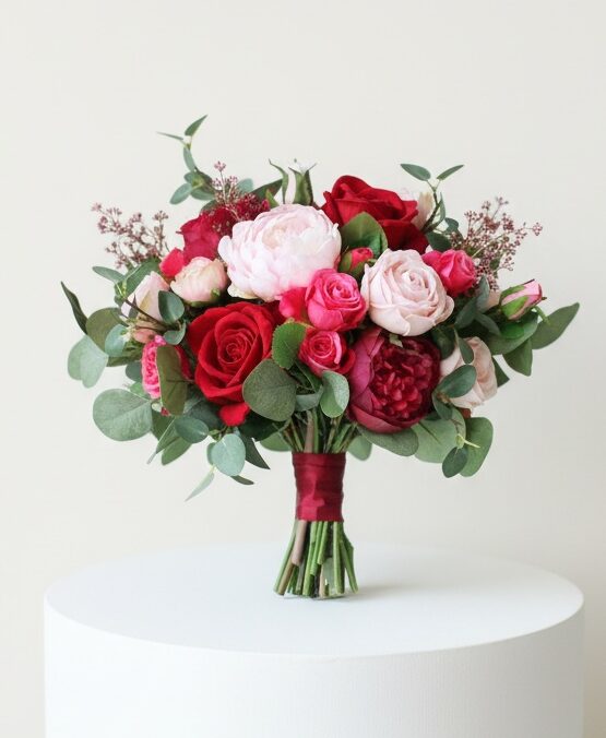 This beautiful Forest Hot Pink & Purple Red, Red Silk Flower Bouquet is a combination of Roses, Peonies, Eucalyptus Greenery, etc.. It is perfect for wedding and decoration.