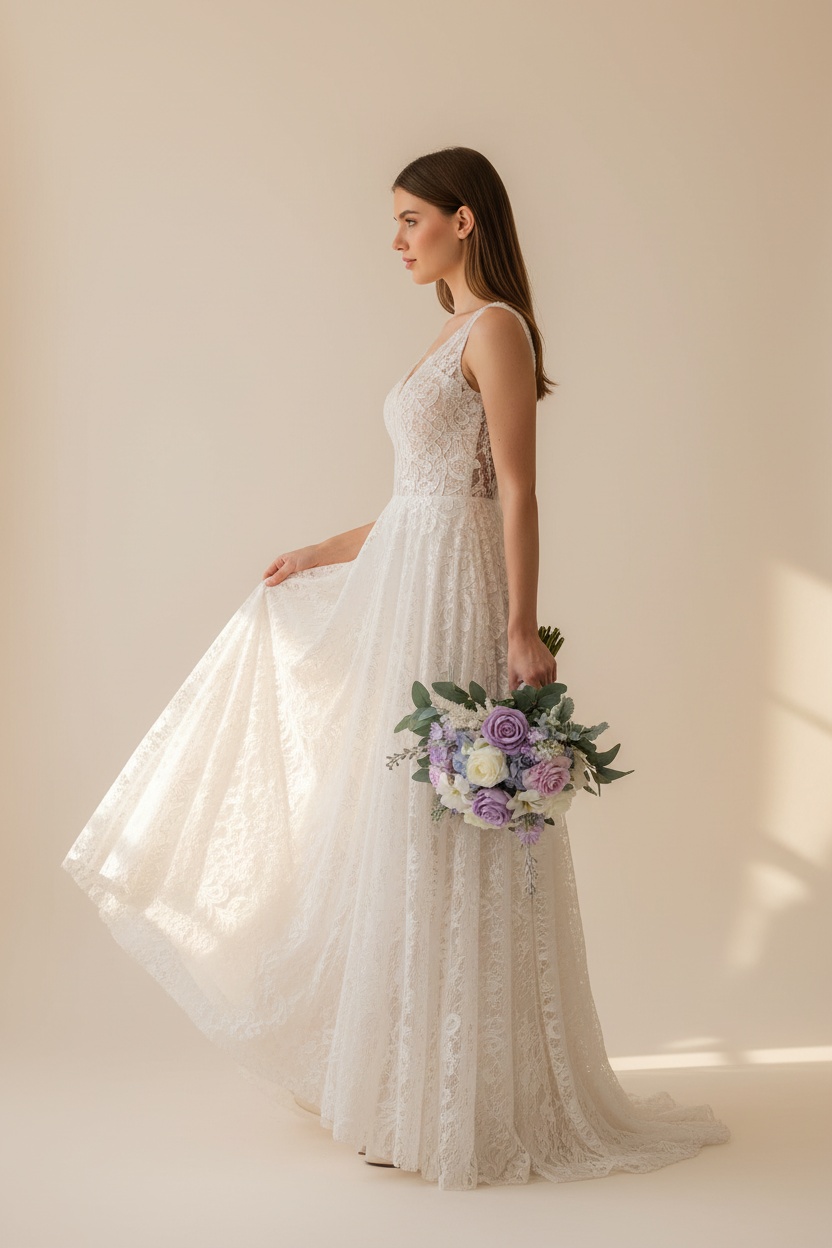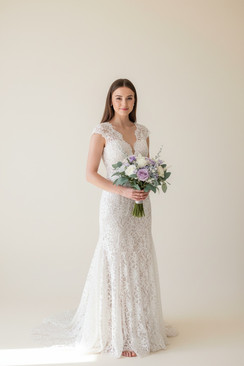 Flower Types: Lavender, blush pink, and ivory roses, filler blooms, and soft greenery