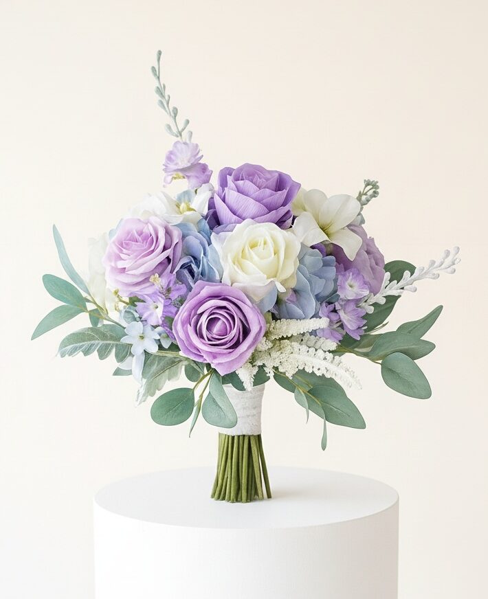 Make your special day unforgettable with this elegant pastel rose bridal bouquet. Featuring a delicate arrangement of lifelike artificial roses in soft lavender, blush pink, and ivory tones, this bouquet exudes timeless romance and modern sophistication. Accented with subtle filler flowers, eucalyptus-style greenery, and wrapped in a smooth ivory satin ribbon, it’s perfect for brides seeking a graceful and lasting floral touch.
