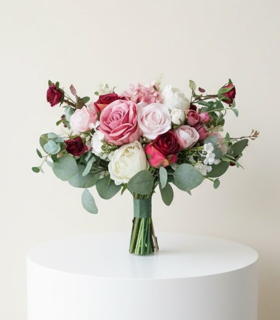 This beautiful artificial silk flower bouquet is made of all bright Autumn colours silk artificial flower – it is a combination of Roses, Hydrangea Macrophylla, Peonies, Freesia, Eucalyptus Greenery etc.. It is perfect for wedding and decoration
